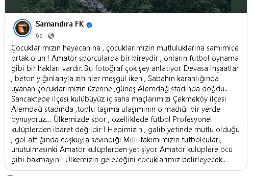 “Bu fotoğraf çok şey anlatıyor. Devasa betonlar yükselirken; sabahın karanlığında uyanan çocuklarımızın üzerine güneş Alemdağ Stadı’nda doğuyor.”