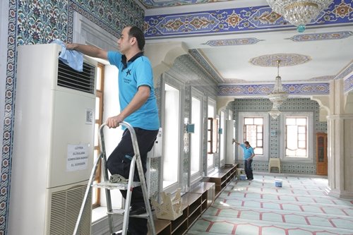 Küçükçekmece Belediyesi Destek Hizmetleri Müdürlüğü’nün verdiği hizmet kapsamında camilerin halıları süpürülüyor (Kış mevsiminde) ve yıkanıyor (Yaz mevsiminde); toz alınıyor, camlar ve ayakkabılıklar, mihrap, kürsü, minber vs. camilerin her yeri dip köşe temizleniyor. 4’er kişilik 2 ekip halinde çalışan ‘Küçükçekmece Belediyesi Temizlik Timi’, 93 Cami ve Mescit ile 42 Kuran Kursu’nun temizliğini yapacak.
