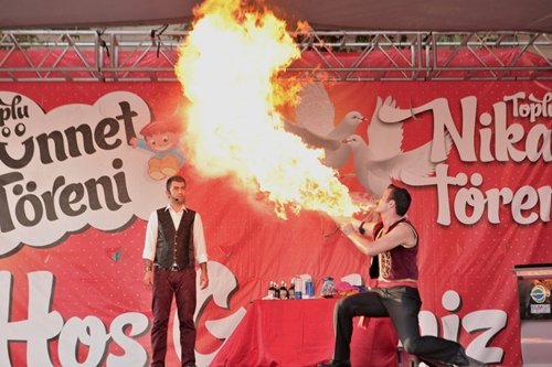 Sünnet coşkusuyla alanı dolduran çocuklar illüzyon, jonklör, ateş dansı, animasyon gösterileriyle doyasıya eğlendi, kendileri için sergilenen gösterileri ilgiyle izleyen çocukların sevincine aileleri ve davetliler de eşlik etti.