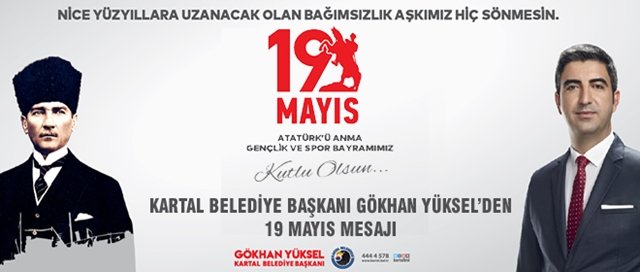 İstanbul`un en genç Belediye Başkanı Gökhan Yüksel, 19 Mayıs Atatürk’ü Anma Gençlik ve Spor Bayramı’nın 100 .Yılı dolayısıyla bir mesaj yayımladı. Kartal Belediye Başkanı Gökhan Yüksel mesajında, "Türkiye Cumhuriyeti’ne bağlı gençler olarak üzerimize düşen görev ise; bize hatırlatılan bu bilgiyle, çağdaş fikirlerimizi korkusuzca büyütmek ve bu fikirlerle bahar çiçeklerinin açtığı bir ülkeye doğru o büyük adımı atmaktır" ifadelerine yer verdi.