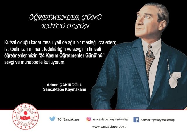 Sancaktepe Kaymakamı Adnan Çakıroğlu mesajında ; " Kutsal olduğu kadar mesuliyeti de ağır bir mesleği icra eden; istikbalimizin mimarı, fedakârlığın ve sevginin timsali öğretmenlerimizin 24 Kasım Öğretmenler Günü’nü sevgi ve muhabbetle kutluyorum.