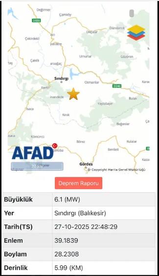 AFAD tarafından paylaşılan detaylı bilgilere göre, depremin merkez üssü Balıkesir/Sındırgı olarak kaydedildi. Büyüklüğü 6.1 (Mw) olan deprem, 39.18389 N enlemi ve 28.23083 E boylamında konumlandı.