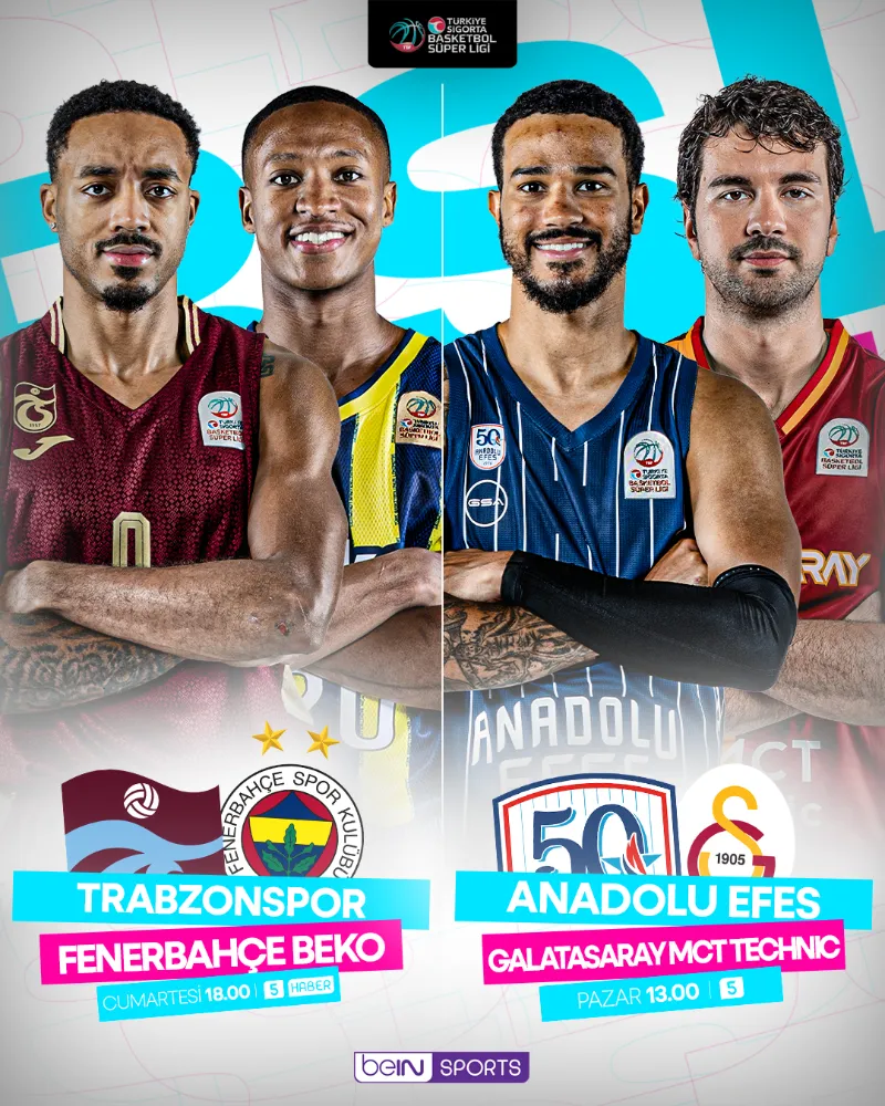 Türkiye Sigorta Basketbol Süper Ligi’nde 2025-2026 sezonu, bu hafta sonu oynanacak iki önemli karşılaşmayla devam ediyor. Trabzonspor, 20 Aralık Cumartesi günü saat 18.00’de Hayri Gür Spor Salonu’nda Fenerbahçe Beko’yu ağırlarken; Anadolu Efes, 21 Aralık Pazar günü saat 13.00’te Basketbol Gelişim Merkezi’nde Galatasaray MCT Technic’i konuk edecek. Ligdeki bu kıyasıya rekabet, sadece Türkiye’nin spor ekranı beIN SPORTS’ta basketbolseverlerle buluşacak. Her hafta olduğu gibi beIN SPORTS HABER’den şifresiz olarak ekranlara gelecek iki karşılaşmadan diğeri ise pazar günü saat 18.00’deki Yukatel Merkezefendi – Türk Telekom mücadelesi olacak.
