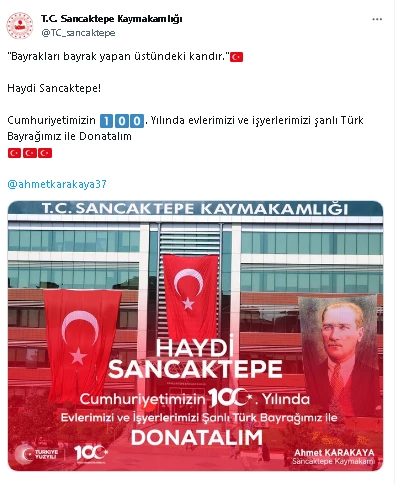 İstanbul Valiliği'nin çağrısının ardından Sancaktepe Kaymakamı Ahmet Karakaya, sosyal medya hesabından yaptığı duyuruda evlere ve iş yerlerine bayrak ve flamalarla donatılması için Haydi Sancaktepe çağrısında bulundu.