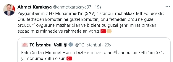 " İstanbul’un Fethi’nin 571'inci yıl dönümü kutlu olsun.