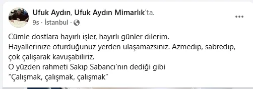 “Cümle dostlara hayırlı işler, hayırlı günler dilerim. Hayallerinize oturduğunuz yerden ulaşamazsınız. Azmedip, sabredip, çok çalışarak kavuşabiliriz. O yüzden rahmeti Sakıp Sabancı’nın dediği gibi ‘Çalışmak, çalışmak, çalışmak’.”