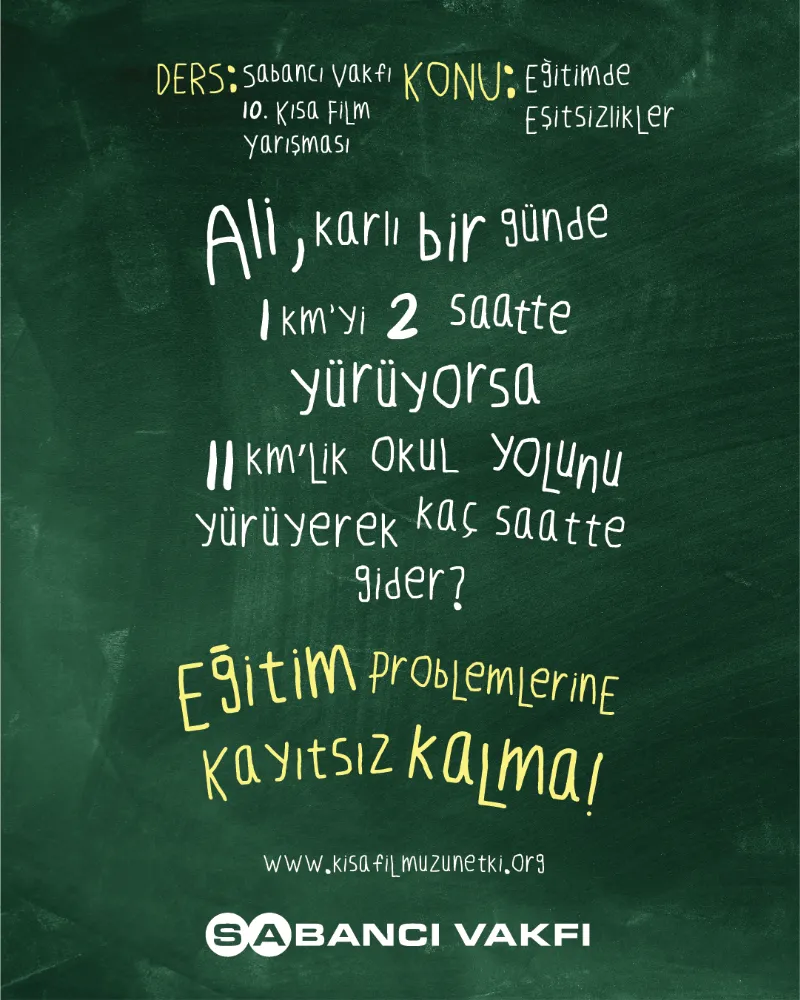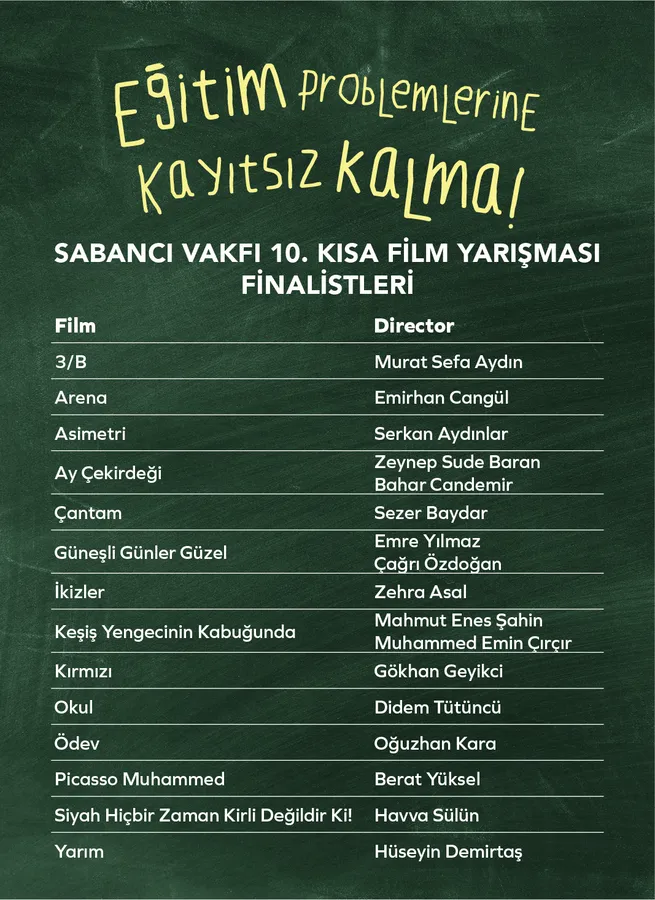 Sabancı Vakfı tarafından, eğitimde yaşanan eşitsizliklere dikkat çekmek amacıyla “Kayıtsız Kalma” sloganıyla düzenlenen 10. Kısa Film Yarışması’nın finalistleri belli oldu. Türkiye’nin dört bir yanından yönetmenlerin yoğun ilgi gösterdiği yarışmada 14 film finale kaldı.