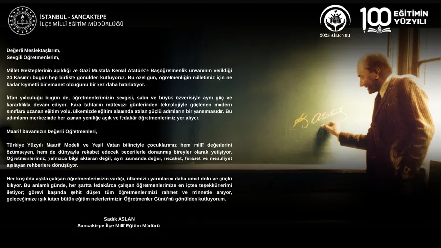 Sancaktepe İlçe Milli Eğitim Müdürü Sadık Aslan, 24 Kasım Öğretmenler Günü dolayısıyla bir mesaj yayınladı.