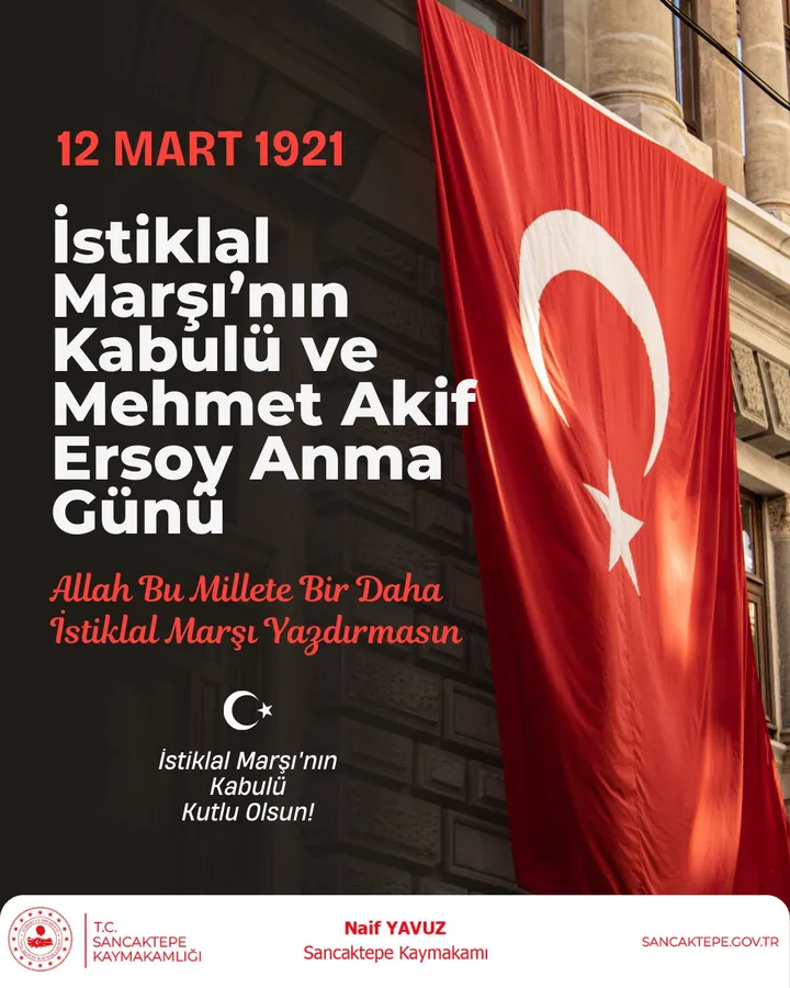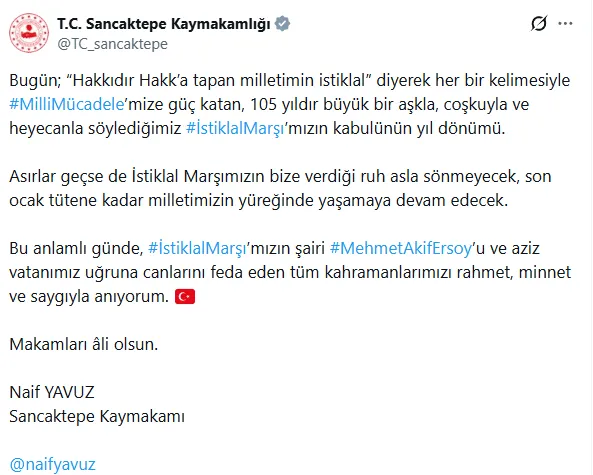 Sancaktepe Kaymakamı Naif Yavuz yayımladığı mesajda, İstiklal Marşı’nın kabulünün yıl dönümünü büyük bir gurur ve coşkuyla andıklarını belirtti. Yavuz, İstiklal Marşı’nın her bir kelimesinin Milli Mücadele ruhunu yansıttığını ifade ederek, bu eşsiz eserin Türk milletinin bağımsızlık ve özgürlük mücadelesine güç verdiğini dile getirdi.