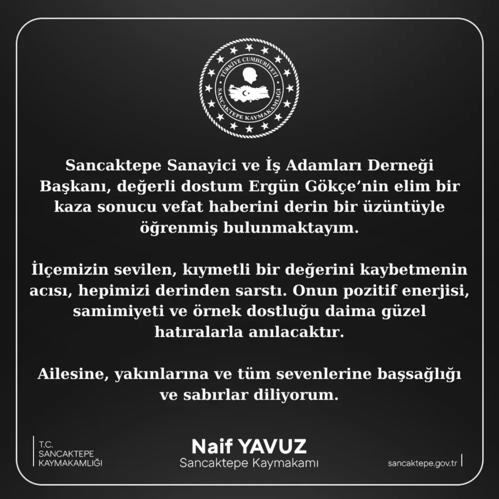 “Sancaktepe Sanayici ve İş Adamları Derneği Başkanı, değerli dostum Ergün Gökçe’nin elim bir kaza sonucu vefat haberini derin bir üzüntüyle öğrenmiş bulunmaktayım.